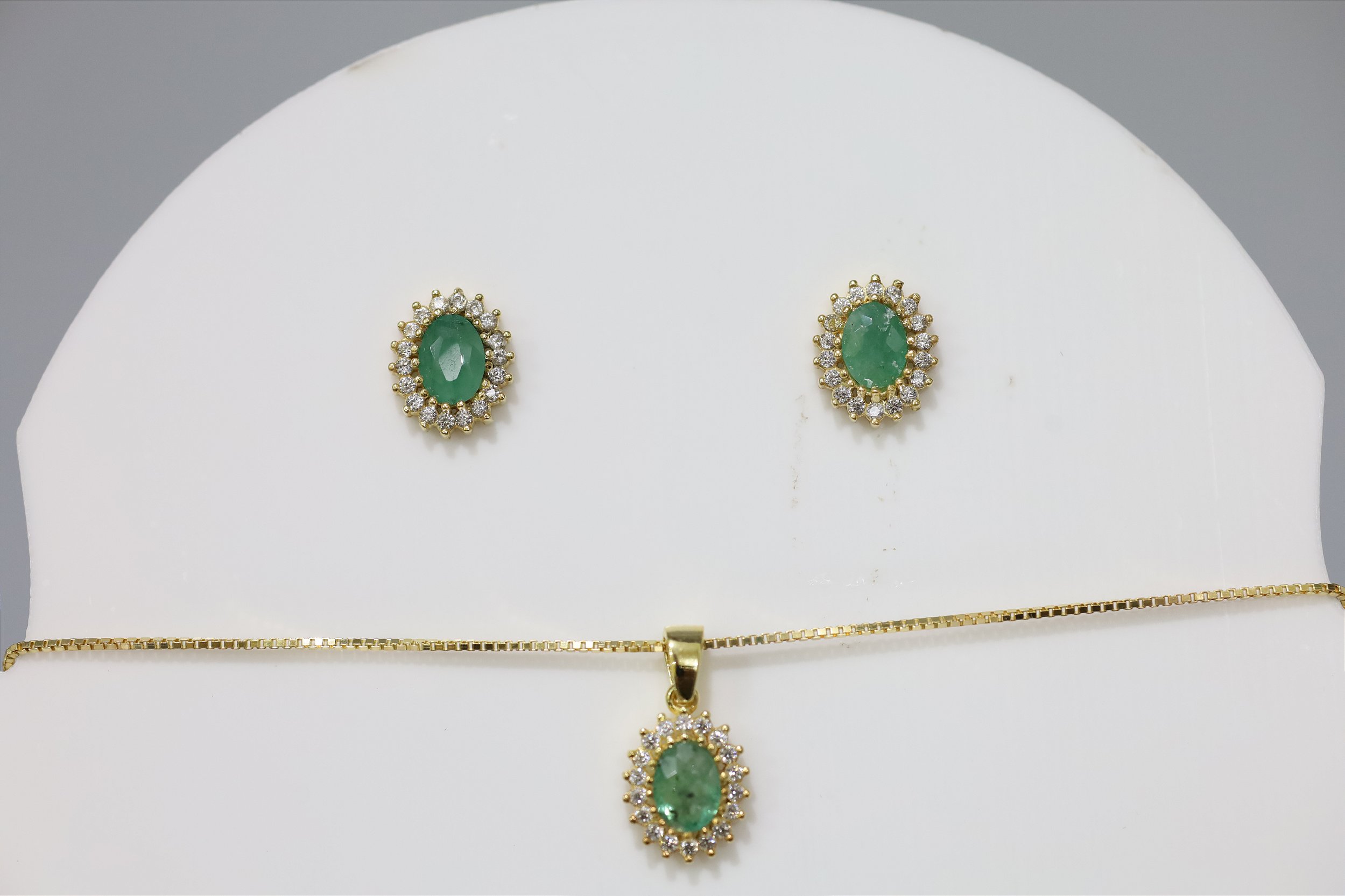 Brincos, Pingente e corrente em prata banhado a ouro com esmeralda natural