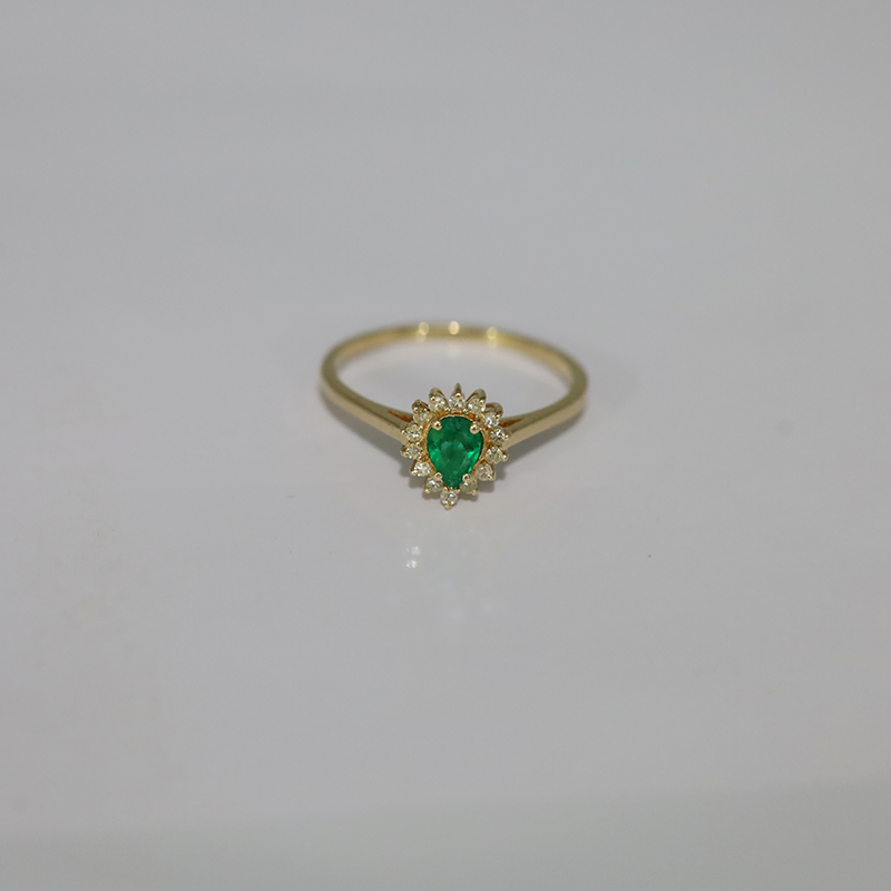 Anel de Esmeralda em Ouro 18k Cravejado com Diamantes, Lapidação gota.
